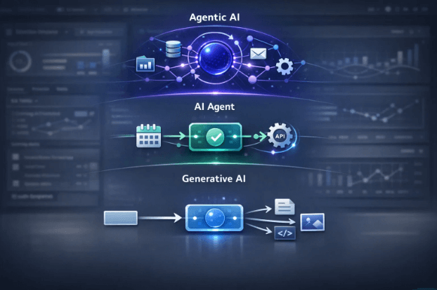 Generative AI creates content such as text, images, or code based on prompts. Agentic AI goes further — it can plan steps, make decisions, and execute actions across systems to achieve a defined objective. Generative AI answers; agentic AI acts.